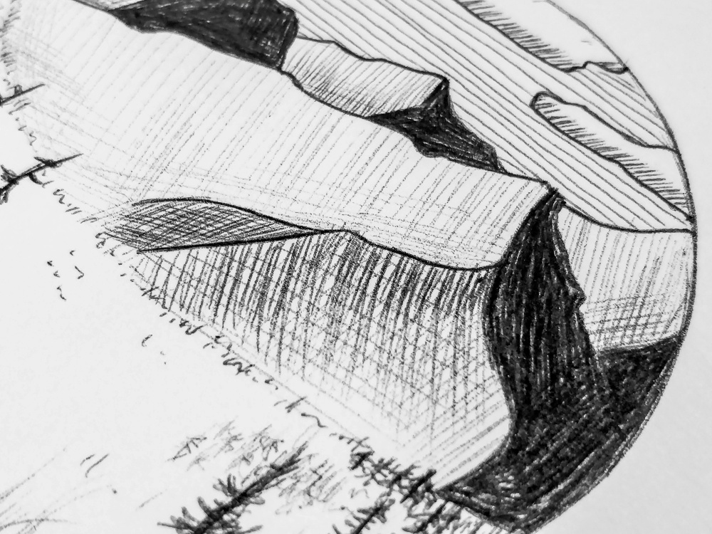 The most important thing is to cross hatch following the slope of the outline. If a line is going downwards diagonally, like the line that divides the sunny and shady sides of the mountain, the main hatch should be in the same direction. Then you add shadows by following the outline of the sunny side of the mountain, a direction that will cross the hatch lines to make little squares.