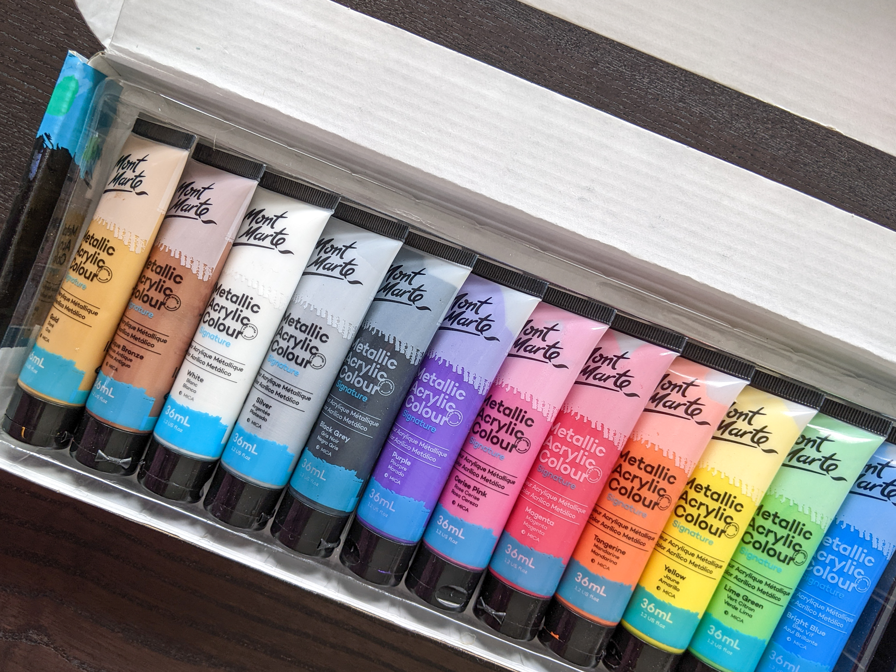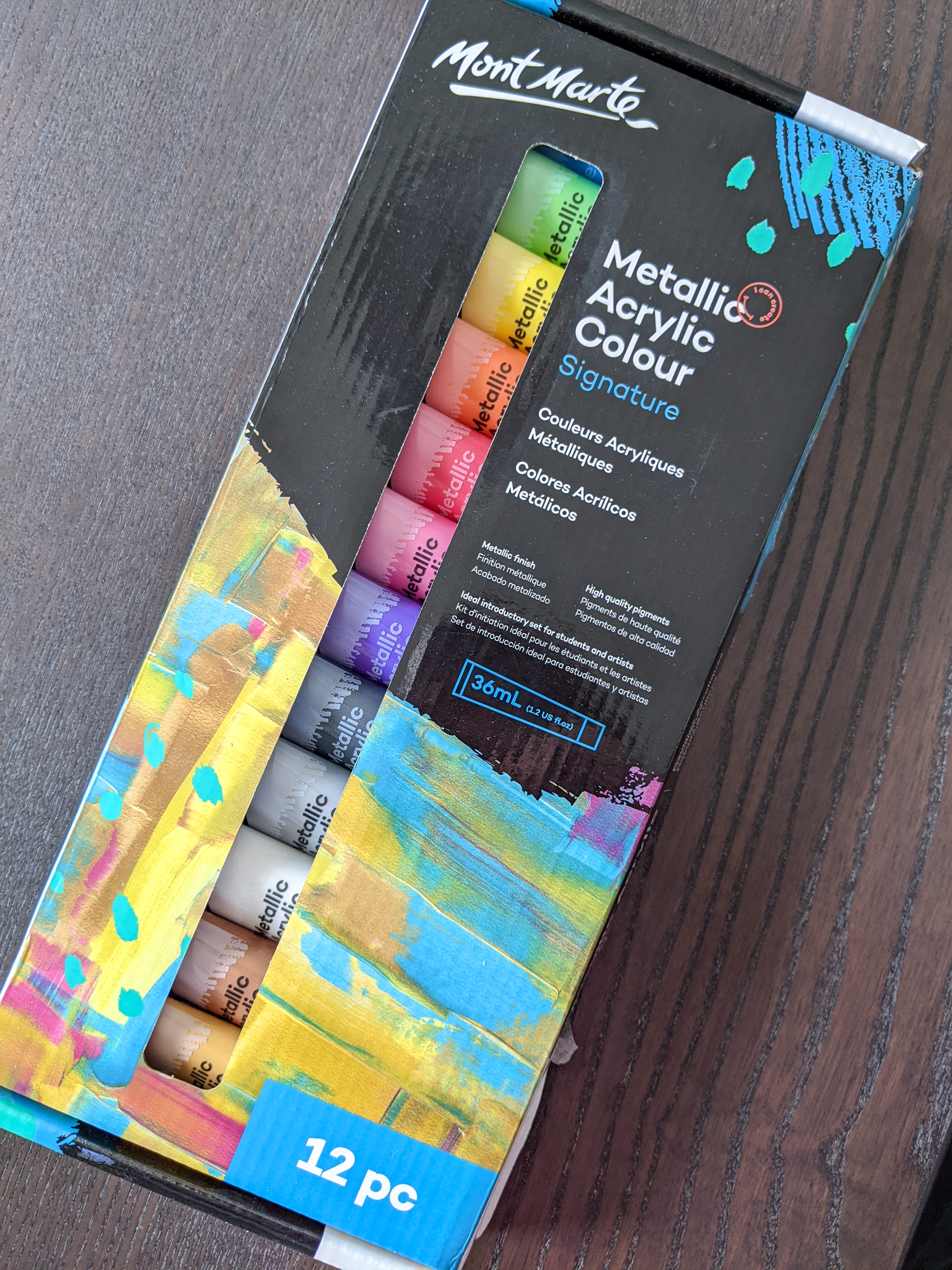 I received the 12-piece Mont Marte Metallic Acrylic Colour set as a gift while hanging out in South Africa last August. Here in Canada, you can purchase this set for around $30.