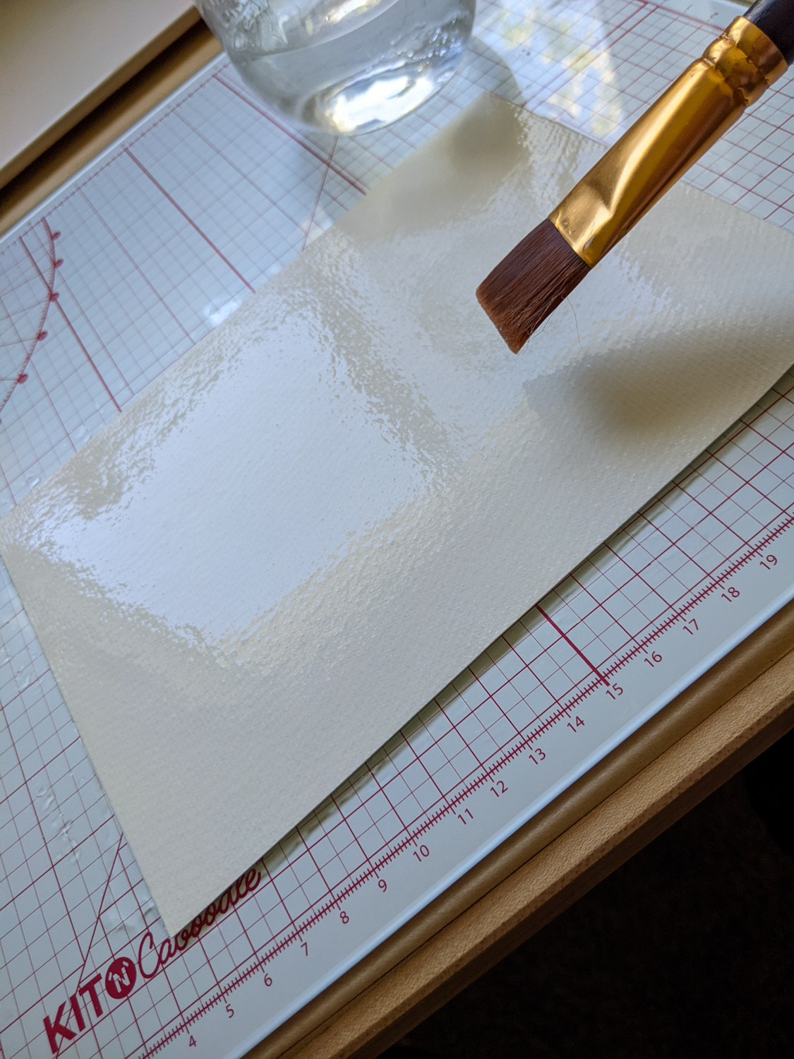 When wetting the page with a paintbrush or spray bottle, it’s important to wet both sides of the page. I like to start with the back of the page first, then flip it over and wet the front part on the surface onto which I’ll secure the page in the next step. I do it this way so I don’t have to handle the paper too much while it’s wet.