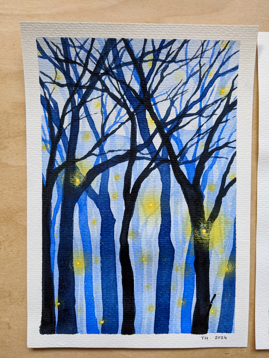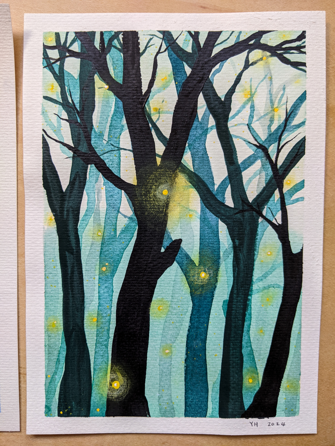 I painted these simple forest scenes using watercolours and gouache, then added details with chalk pastels, watercolour pencils, and paint pens.